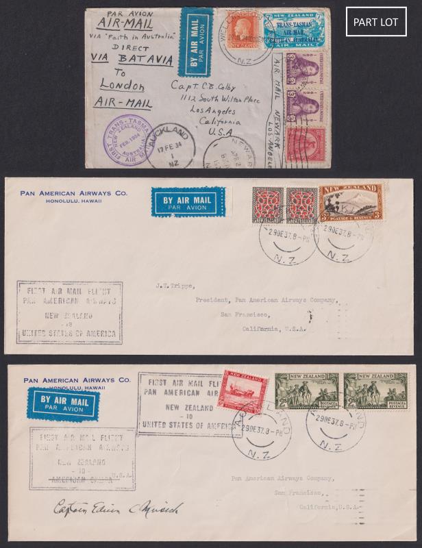730 C imageNZ 1934-85 to USA x 26 various FFCs. Noted 1934 Trans-Tasman cacheted cover endorsed Via Batavia to London Air-Mail, with NZ & US adhesives. Also 2 diff 1938 Pan Am cacheted covers to San Francisco, one signed by pilot Captain Edwin Musick. Ex Bob Watson (Image)