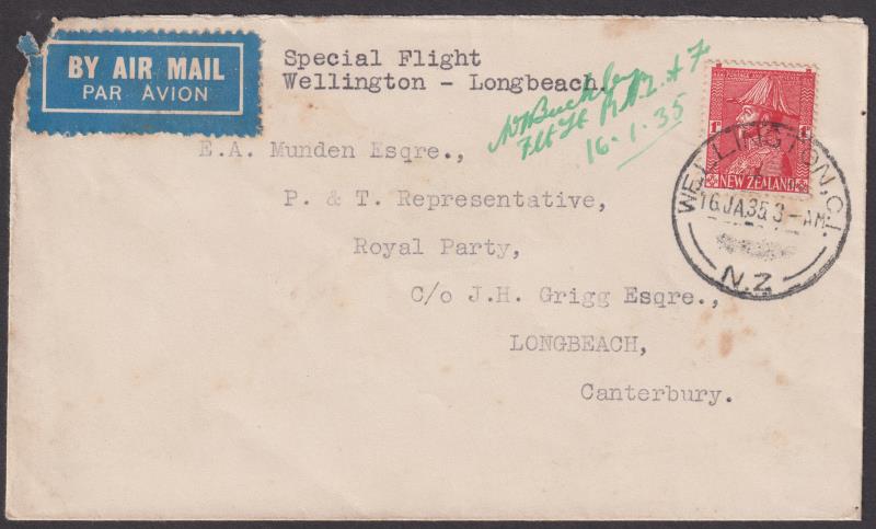 731 C imageNZ 1935 Duke of Gloucester Royal Tour special flight Wellington-Longbeach Station (16 January 1935) signed by pilot Flt Lt M W Buckley. One of 5 known from 16 covers believed to have been flown (NZAMC listing being updated). NZAMC 115c. Minor faults. Cat $1000. (Image)