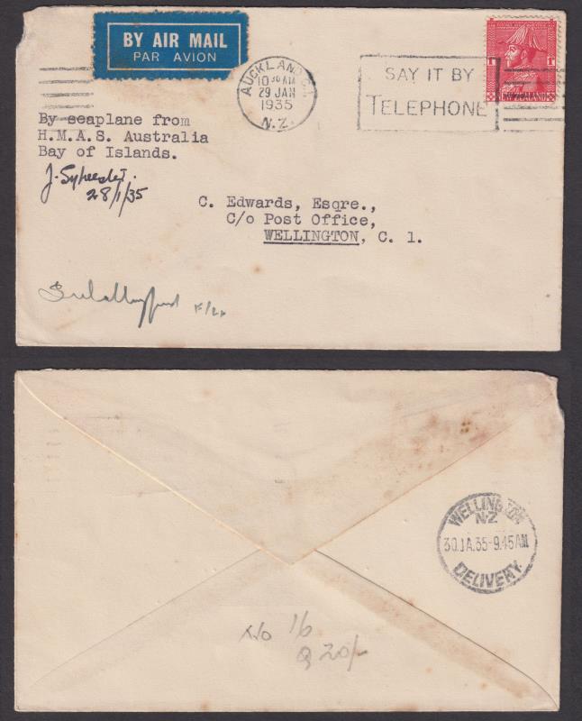 732 C imageNZ 1935 Duke of Gloucester Royal Tour special flight Bay of Islands-Wellington (29 January 1935) carried by seaplane from H.M.A.S. Australia in the Bay of Islands to Auckland by Lt L J Sylvester & then to Wellington by Flt Lt S Wallingford & signed by both pilots. Has Auckland C.I. 29 JAN cds & Wellington Delivery 30 JA 35 b/s. One of 3 known (NZAMC listing being updated). Minor faults. NZAMC 115i. Cat $1500. (Image)