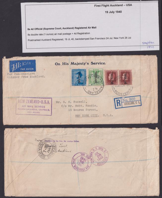 733 C imageNZ 1940 double rate, registered OHMS airmail cover to New York, endorsed “Per Pan-American / Clipper from Auckland.” Bearing 8d GV pair, 2/- Admiral & 5/- Arms type (vertical ovpt) Officials, boxed purple NEW ZEALAND-USA / AIR MAIL SERVICE / VIA NEW CALEDONIA, CANTON IS. / AND HAWAII cachet & Auckland 19 July registered cds, ex Supreme Court, Auckland. 8/- (1 oz rate) + 4d regn. Scarce. (Image)