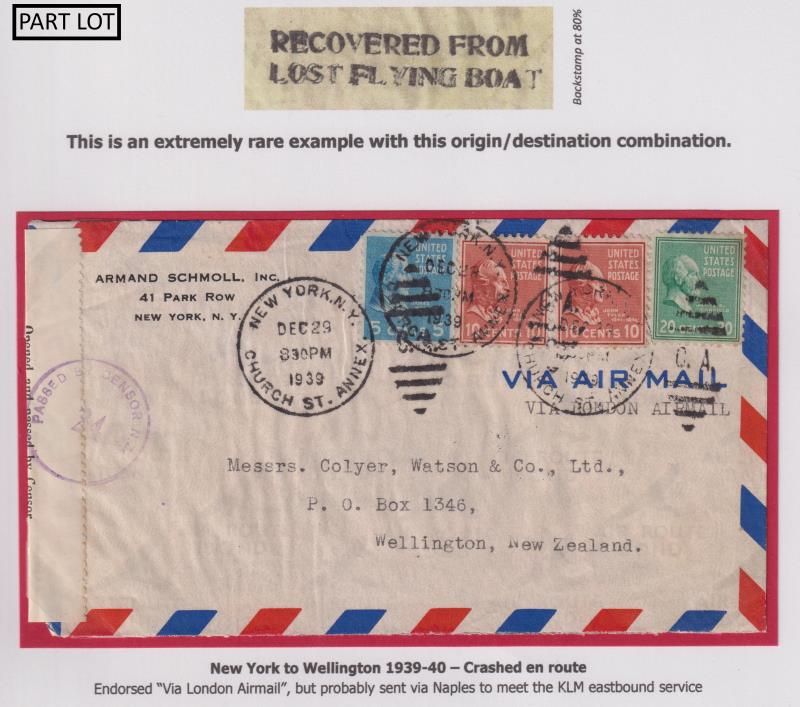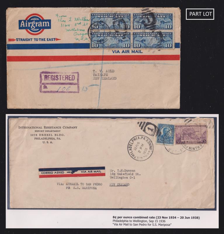 734 C imageUSA 1927-1946 to NZ airmails 1 frame (16 pages) exhibit commencing with airmail acceleration within USA, Eastbound & Westbound mails to NZ, to US Navy Air Transport. Incl 1936 Zeppelin (Hindenburg) cover to Greymouth & 1940 Batavia crash mail cover (1 of 6 known to NZ). 27 covers. Ex Bob Watson. (Image)
