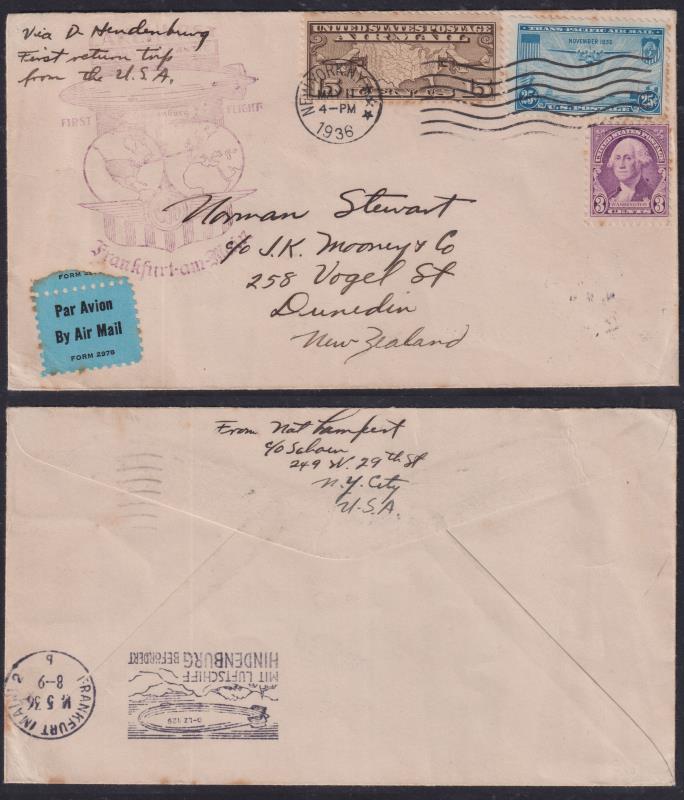 736 C imageUSA 1936 Hindenburg Zeppelin cacheted first flight cover to NZ, ex Lakehurst 12 May, with pictorial Frankfurt b/s & a few edge tones. Scarce. (Image)