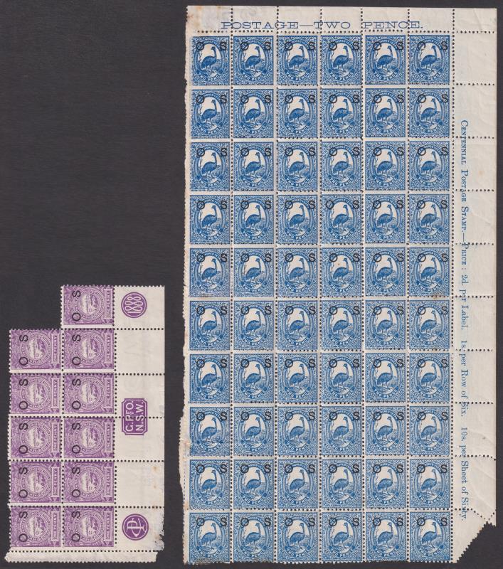 737 M* imageNSW 1888 2d Emu full sheet of 60, O S, p11 x 12, upright crown/NSW wmk, but no left or lower selvedges with 2 different (R1/5 & R1/6) damaged “O” in “OS” varieties, together with paper fold at lower right corner resulting in skewed selvedge perfs. Column 1 & part of column 2 bear remnant adhesions of another sheet of stamps – possibly the cause of the perforation variety. 38 are MUH and are free of odd tone/adhesion. SG O40. Also, 1888 1d Sydney View, O S, p11 x 12, invtd crown/NSW wmk, CP & 1888 monogram block of 11 from lower right pane (some selvedge damage), 2 hinged, rest MUH, odd tone spot & adhesion. SG O39. (Image)