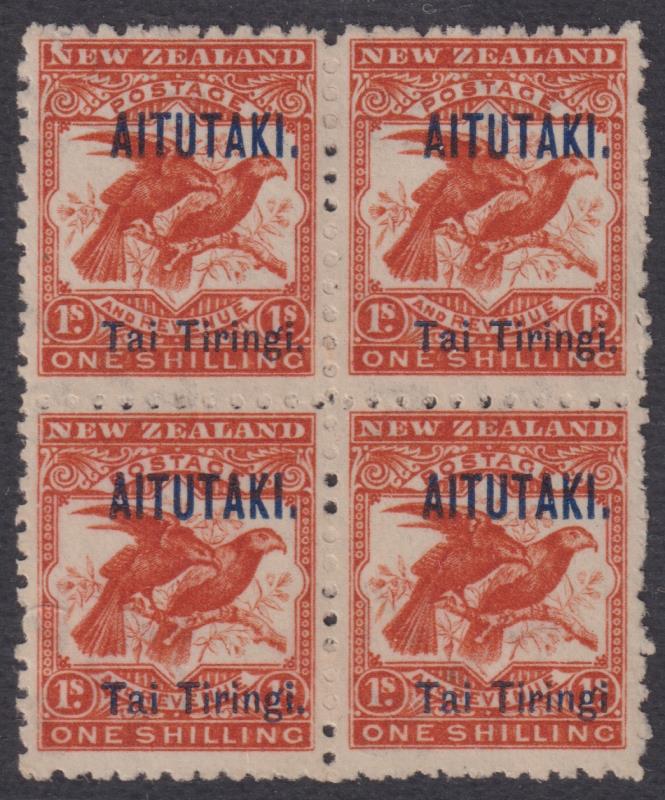 740 M imageAitutaki 1903 1/- Kaka orange-red shade block of 4 showing no stop after Tiringi. Minor gum disturbance. SG 7b, 7ba. Cat £1075. Mint. (Image)