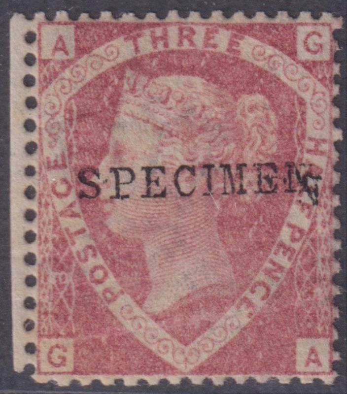1870 1½d rose-red, "SPECIMEN" ovpt (SG Type 9), plate 3 (AG-GA), small part sheet margin at left. Ex Baillie. OG. SG Spec