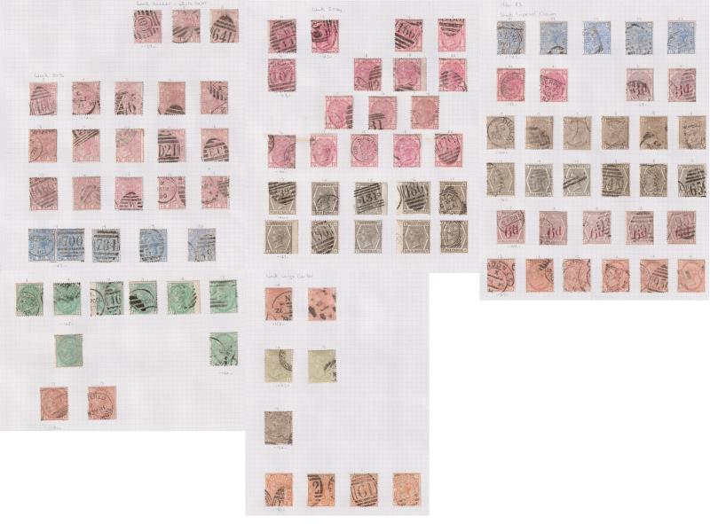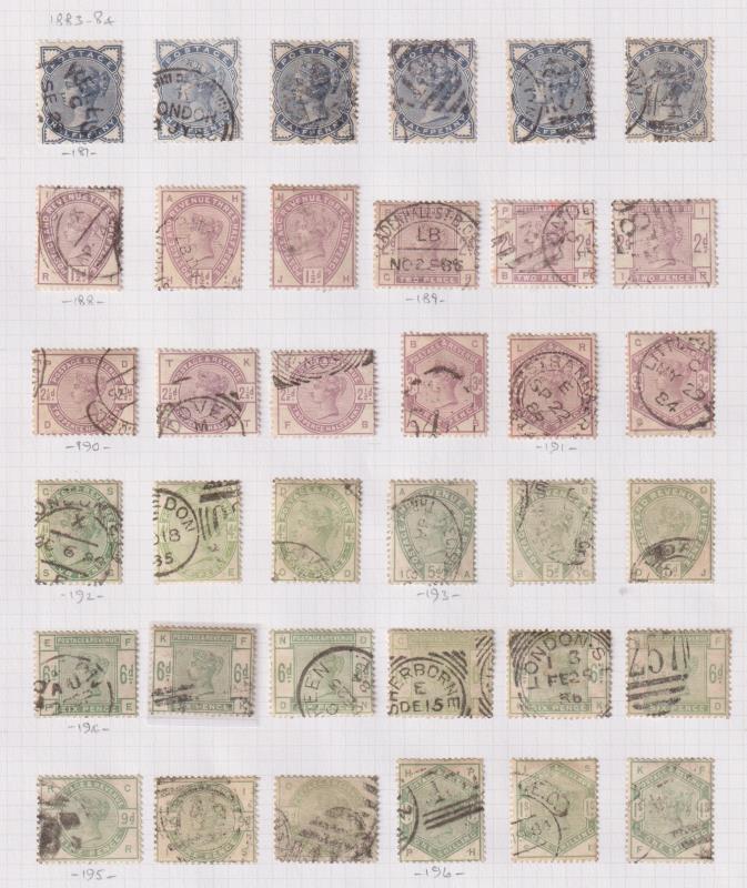 1873-83 2½d - 1/- surface prints large coloured letters specialised used colln on 5 pages, identified by SG No's. Nice range