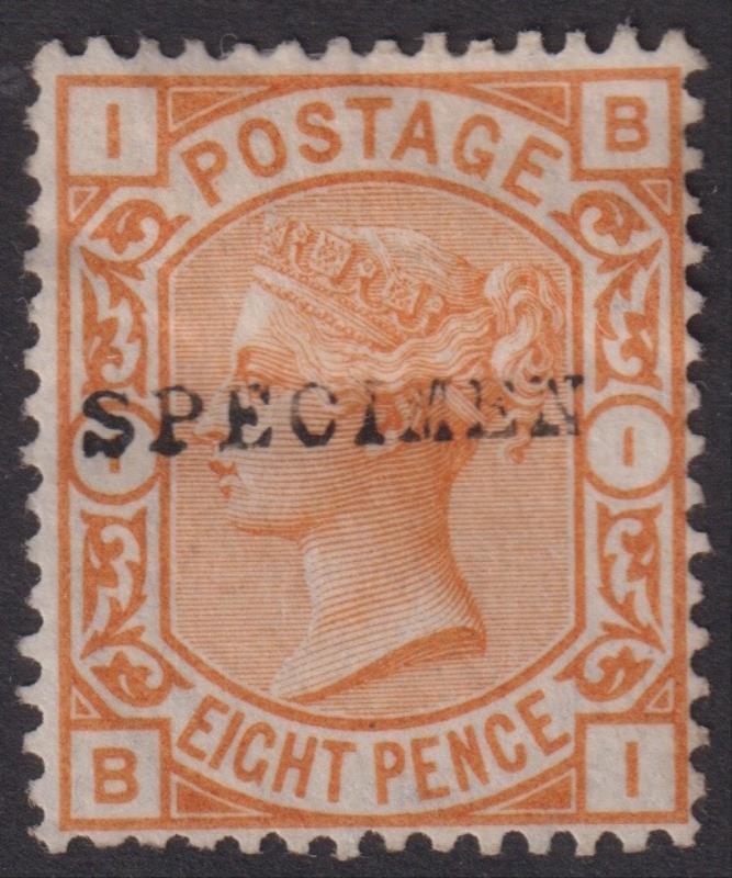 1876 8d orange, "SPECIMEN" ovpt (SG Type 9). SG Spec J91As. Cat from £350. (Image)