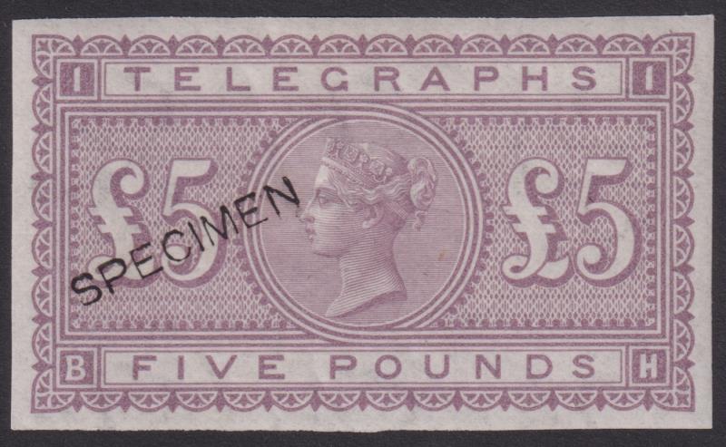 1877 £5 dull mauve Telegraph imperf colour trial, "SPECIMEN" ovpt (SG Type 8), Shamrocks wmk. SG Spec L237 var. Cat £1300.