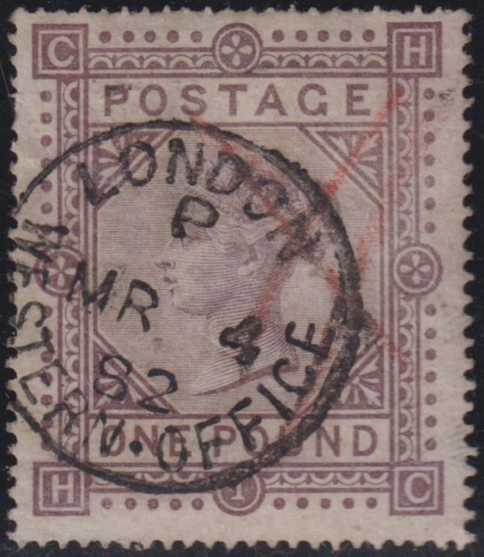 1878 £1 brown-lilac, large uncoloured corner letters, MC wmk, MR 4 82 cds cancel & red registration lines, some nibbled perfs.