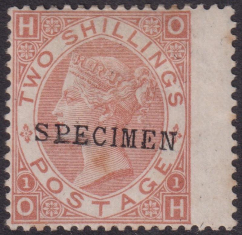 1880 2/- brown, "SPECIMEN" ovpt (SG Type 9), wing margin at right. Gum tonespot just affects perfs at right. SG Spec J120s.