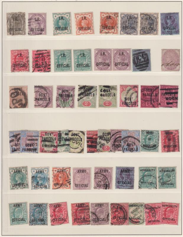 1882-1904 Officials x 51 mainly used on page. Noted: I.R. x 15; Govt Parcels x 17 (incl 1/- QV orange-brown); Board of