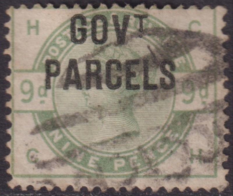 1883 9d dull green, "GOVT PARCELS" ovpt, very reasonable cancel. SG O63. Cat £550. GU/FU. (Image)