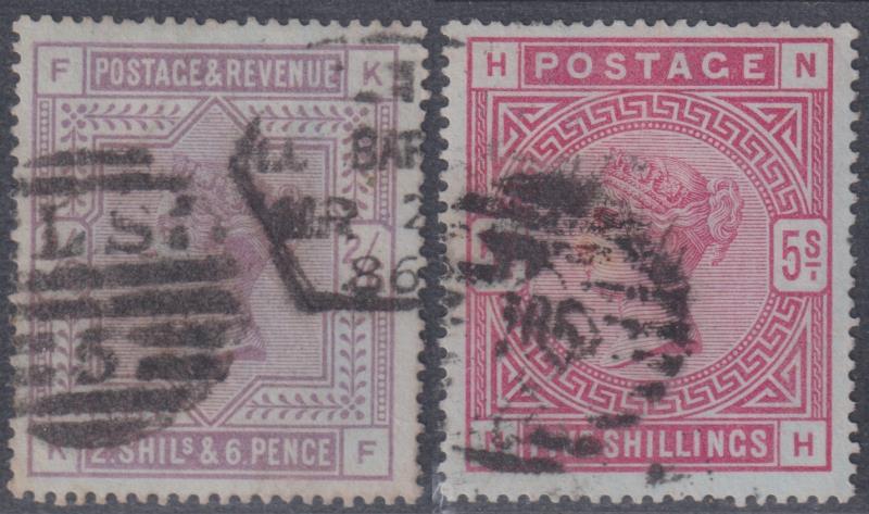 1883-4 2/6d, 5/- blued paper, large coloured letters, anchor wmk, 5/- slightly pulled perf. SG 175, 176. Cat £4750. GU. (Image)