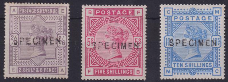 1884 2/6d, 5/-, 10/-, coloured letters, white paper, all large "SPECIMEN" ovpts (SG Type 11), minor blemishes. SG Spec K10s,