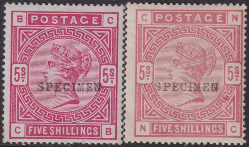 1884-c90 5/- x 2 rose & crimson shades, "SPECIMEN" ovpts (SG Type 9), white paper. SG Spec K12 (1,2)t. Cat from £900. (Image)