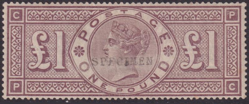 1884 £1 brown-lilac, "SPECIMEN" ovpt (SG Type 9), crowns wmk. Attempt to remove "SPECIMEN" & minor gum tonespots. SG Spec