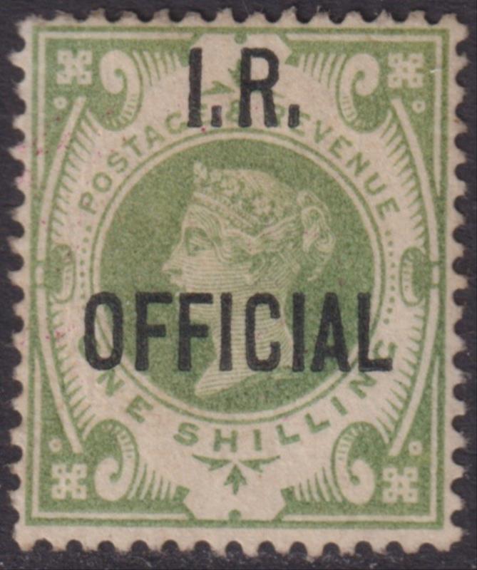 1889 1/- dull green, I.R. OFFICIAL. SG O15. Cat £600. Mint. (Image)