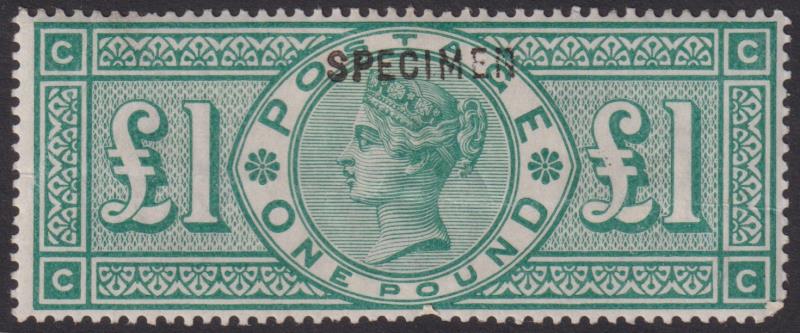 1891 £1 green, "SPECIMEN" ovpt (SG Type 15), light horiz crease not visible from front. SG Spec K17t. Cat from £1100. (Image)
