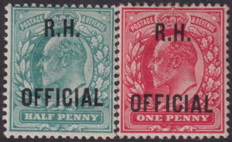 1902 ½d, 1d EVII, "R.H. OFFICIAL" ovpts, cert marks on back. Cat £500. Mint. (Image)