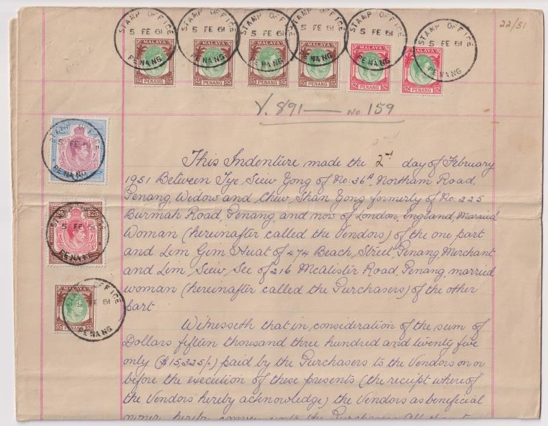 Malaya-Penang 1951 Indenture document for $15,325 with $25 & $100 GVI revenues, also $2 x 2 & $5 x 5 with 5 FE 51 Stamp Office
