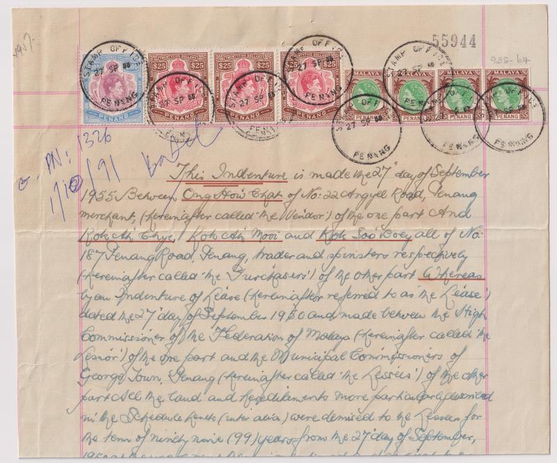 Malaya-Penang 1955 Indenture document for $9,000 with $25 x 3 GVI revenues, also $5 x 3 QEII with 15 AP 55 Stamp Office cds.