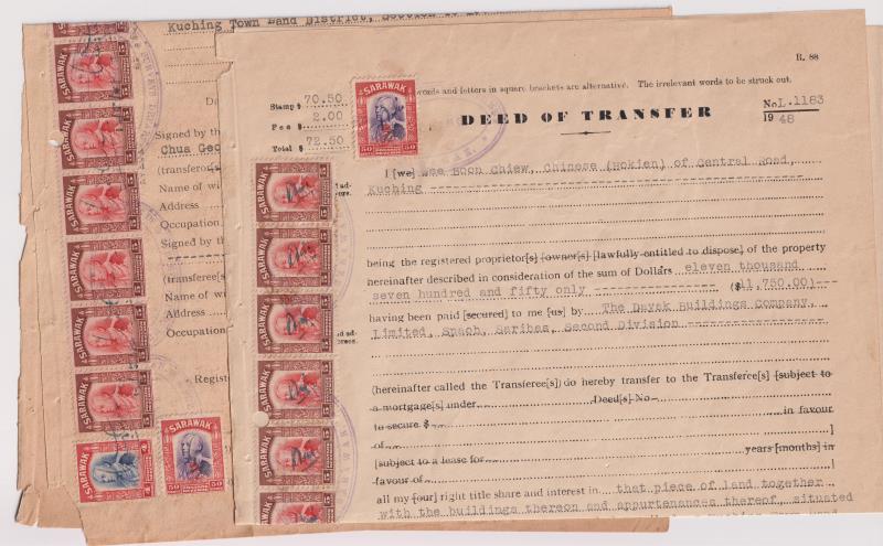 Sarawak 1948 x 2 Deed of Transfer documents with 50c, $4, & $5 x 10 (2 punched, 1 folded) & 50c, $1, $4 x 9 & $5 x 7 (1 folded)
