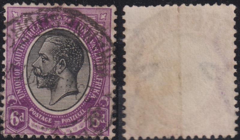 South Africa 1913 6d GV repaired paper variety, vertical paper join 2 halves of Springbok wmk. SASCC 10 var. Cat from