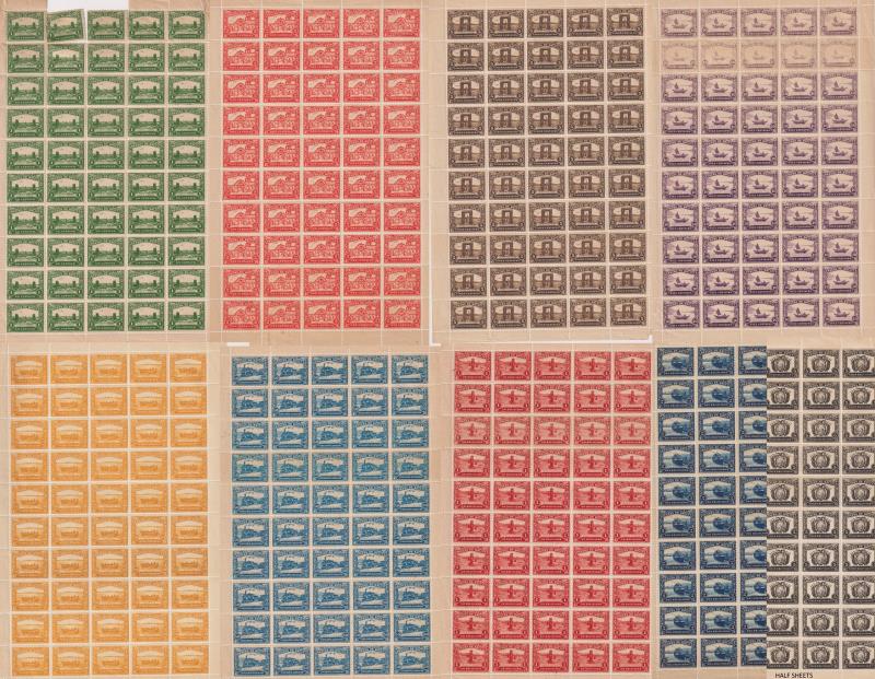 Bolivia 1915 unissued Guaqui Railroad set of 9 values (engraved printing) in full sheets of 50, some selvedge separation & odd