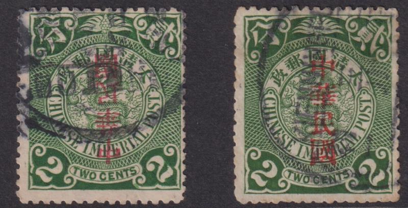 China 1912 2c "Republic of China" invtd ovpt error, printed by Shanghai Commercial Press. With normal. SG 217a. Cat £3750.