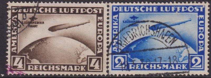 Germany 1930 1st South America Flight inscriptions on 1928 (airship "Graf Zeppelin" over globe): 2Mk blue wmk vertical & 4Mk