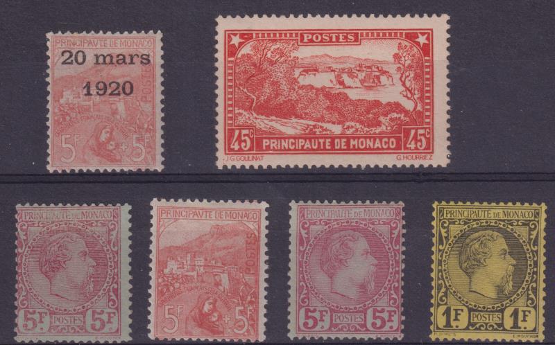 Monaco 1885 1F, 5F (2), 1919 5F War Orphans, 1920 5F Marriage, 1933 45c brick red. SG 9, 10, 37, 47, 127a. Cat £21,850. Sold