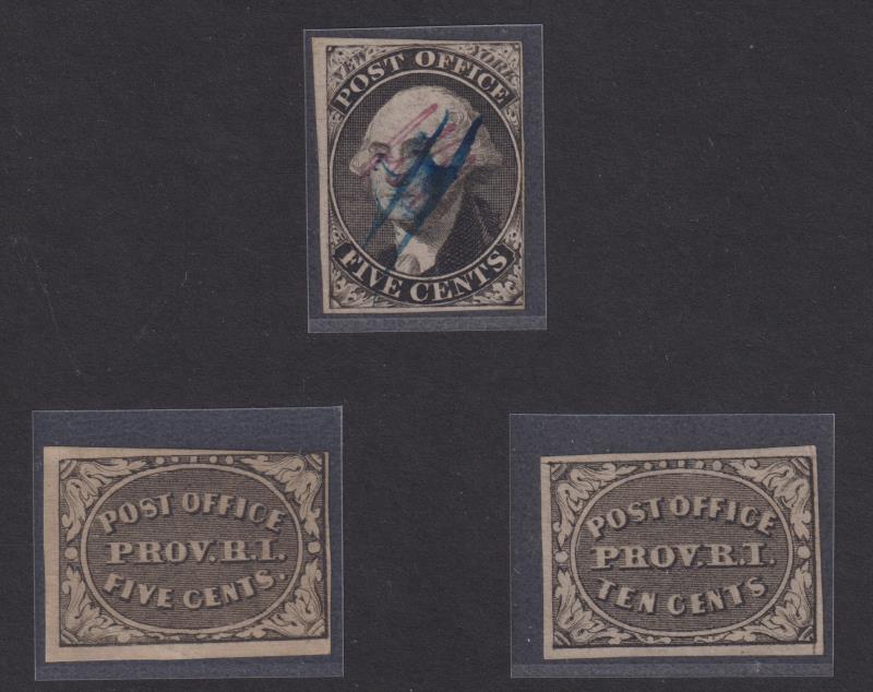 (incl 2 close). Providence RI: 5c gray-black, imperf 3 margins just touches at top, light corner crease, unused, TPF cert (2019). 10c gray-black imperf 4 margins unused. PSE cert (1994), PF certs (1976 & 2019). Scott 9 x 1, 10 x 1, 10 x 2. Cat