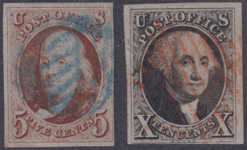 USA 1847 5c Franklin, 10c Washington imperf 4 margins, 5c blue cancel, 10c red cancel (5c light crease, 10c tiny back thin).