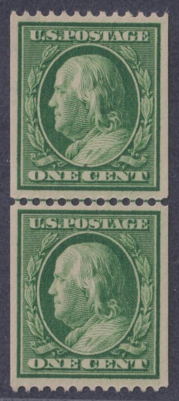 USA 1910 1c Washington green vertical guide line coil stamp pair, single line wmk. PF cert (1995) & PSE cert graded 80 (2018).