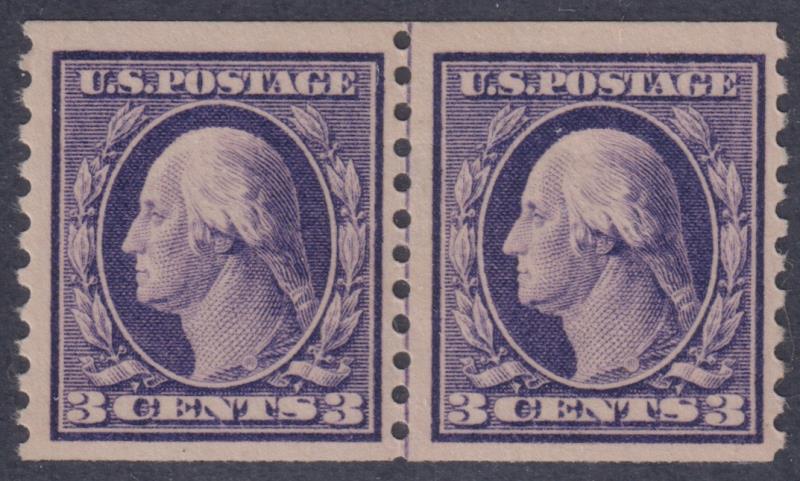 USA 1914 3c Washington violet horiz coil stamp pair, p10 vertically, single wmk. PSAG cert (2012). Scott 445. Cat US$1200.