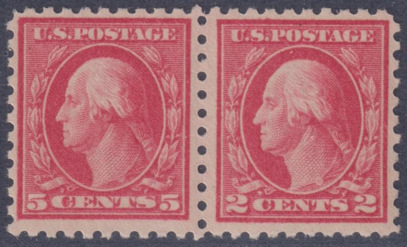 USA 1916 2c & 5c Washington carmine in horiz setenant pair, flat plate printing, p10. PF cert (2017). Note: 5c is error.