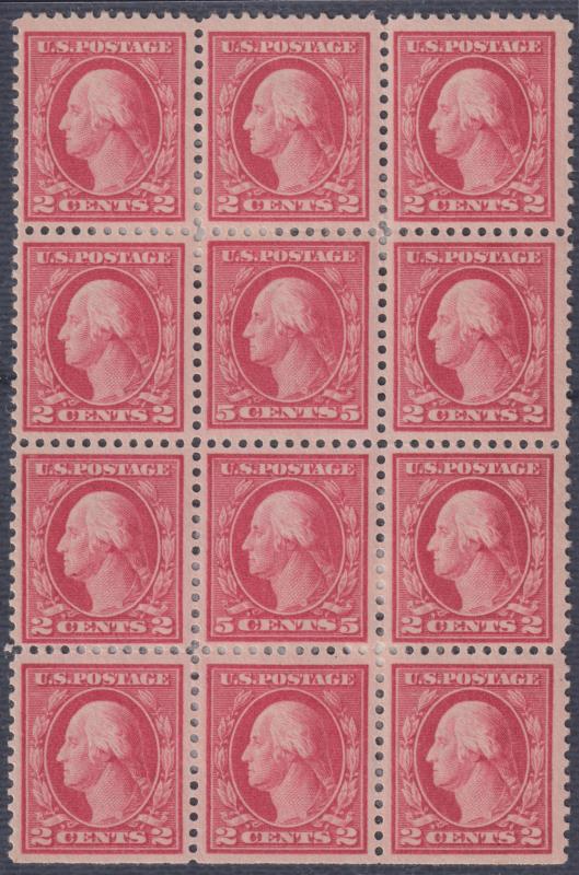 USA 1917 5c Washington rose, error x 2 in centre of vertical block of 12, with 10 2c stamps, flat plate printing, no wmk. PSE