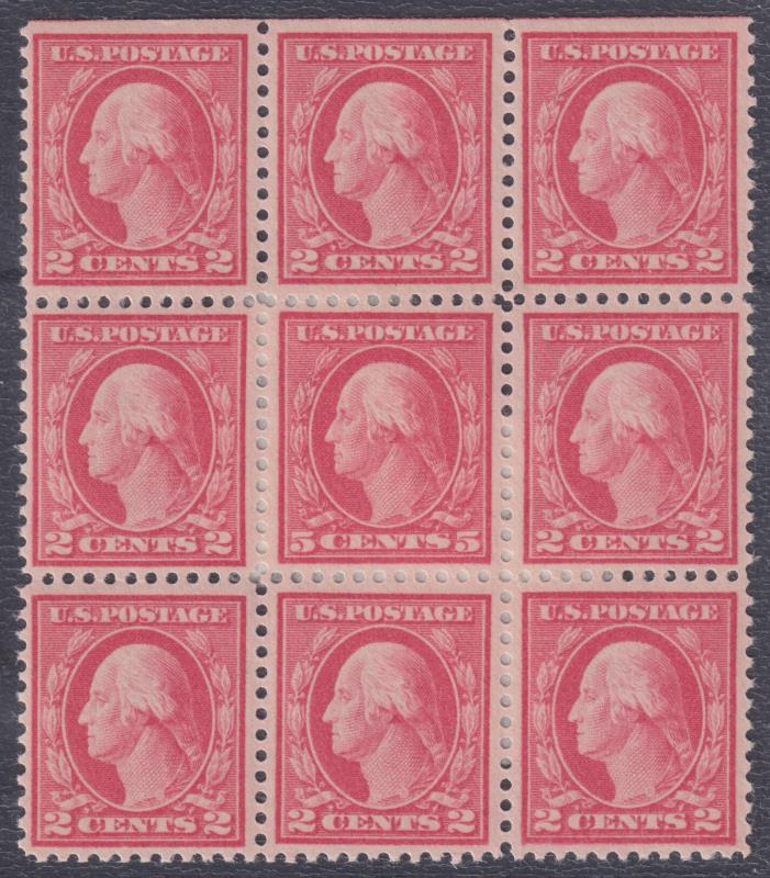 USA 1917 5c Washington rose, error in centre of block of 9 with 8 2c stamps, flat plate printing, no wmk. PF cert (2015).
