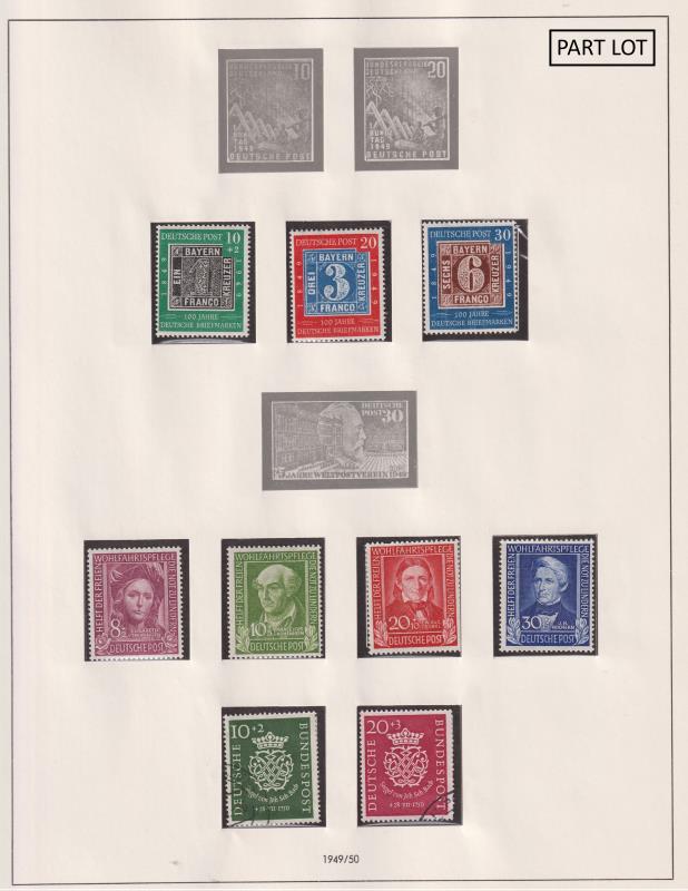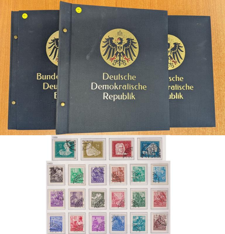 109 U imageGermany-East, West & Unified 1949-2000 comprehensive seln of used in mounts on Davo album pages. Noted East: 1950 JS Bach set of 4 & 1953 Five Year Plan set of 18; West: 1951 National Philatelic Exbn set of 2, 1953 International Philatelic Exbn set of 2 & 1954 Humanitarian Relief Fund set of 4; all FU. Also incl seln of Allied Occupation issues. Weight 6.8kg. SG cat £1700+. (Image)