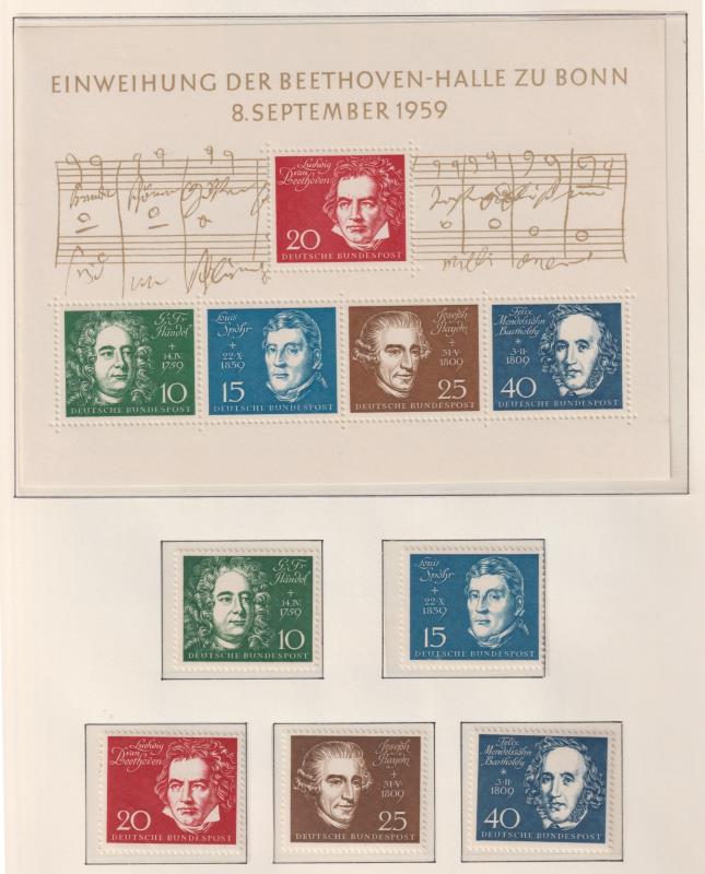 104 / imageGermany-West 1949-68 mix mint/MUH & used colln in "SAFE" hingeless album (pages to 1969) mostly complete. Noted MUH: 1949 Stamp Cent, Relief Fund, 1951 Stamp Exbn sets. FU: 1950 Bach, 1951 Lubeck, 1951-3 Relief Fund sets; & 1949 UPU plain FDC. (Image)