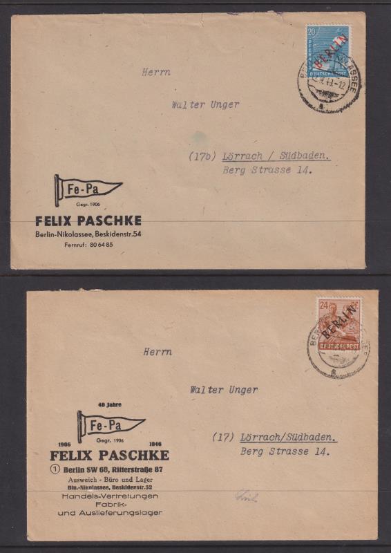 108 C imageGermany-West Berlin 1949 Berlin Airlift covers x 2, both with Berlin-Nikolasse cdss -1 tied to 20pf red "BERLIN" ovpt, pmk dated 12 Sept 1949, the other 24pf black "BERLIN" ovpt, pmk dated 15 Sept 1949. Both typed addressed to "Herrn Walter Unger (17) Lörrach/Südbaden, Berg Strasse 14". The envelopes are commercial printed "Felix Paschke" "Nikolasse" (etc). (Note: Walter is the uncle of the vendor). Scarce items. (Image)