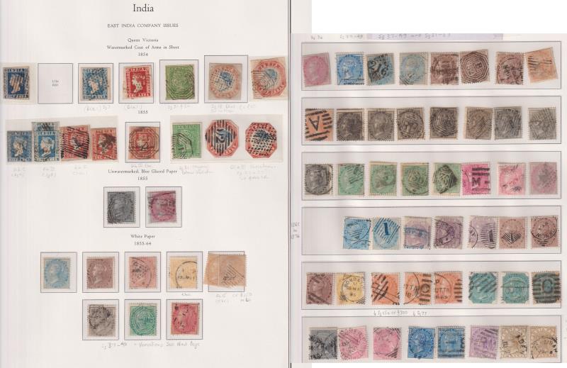 119 / imageIndia & Convention States 1854-1960 mint &/or used specialised colln on pages - some stamps identified by SG No's. Incl c1854-6 x 4 imperfs (very poor cond); c1860-76 "East India" inscribed issues 40+; then good range all Empire Dominion & Republic era (about 400 stamps). Good range Officials from 1867 (100+); Commission in Indo-China issues mint & FU (30 stamps); & about 150 Convention State issues. Tidy lot but missing most high values (no 10r Gandhi). Good cv. (Image)