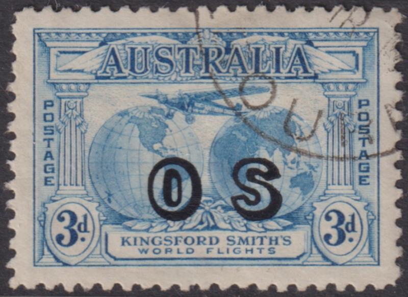 1913 3d Kingsford-Smith blue, "OS". SG O124. Cat £65. FU. (Image)