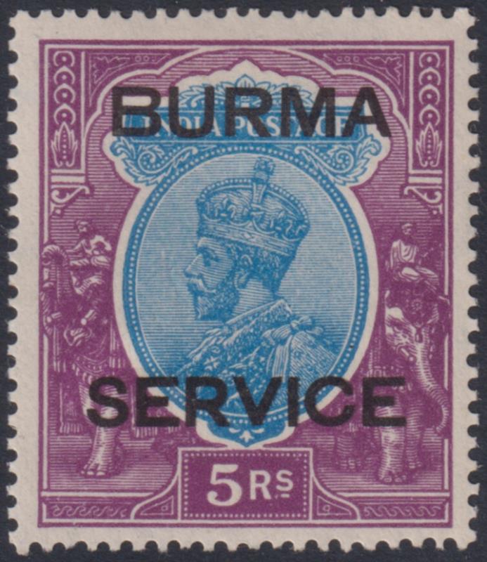 Burma 1937 5r GV service ovpt. SG O13. Cat £250. Mint. (Image)