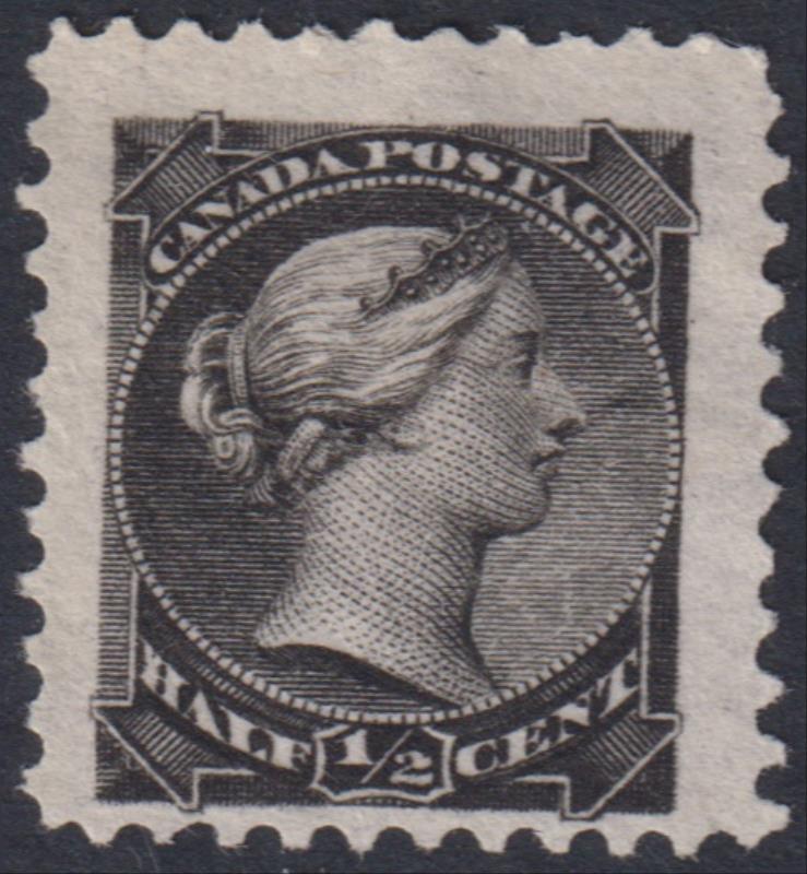 Canada 1868 ½c QV black, p12, thin rather transparent crisp paper, o/c. SG 46. Cat £120. MNG. (Image)