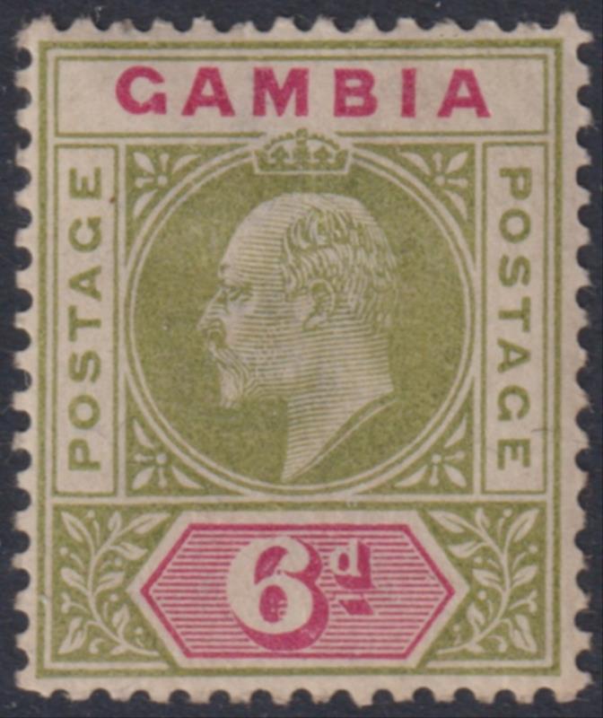 Gambia 1902 6d EVII pale green & carmine, crown CA wmk. SG 51. Cat £20. Mint. (Image)