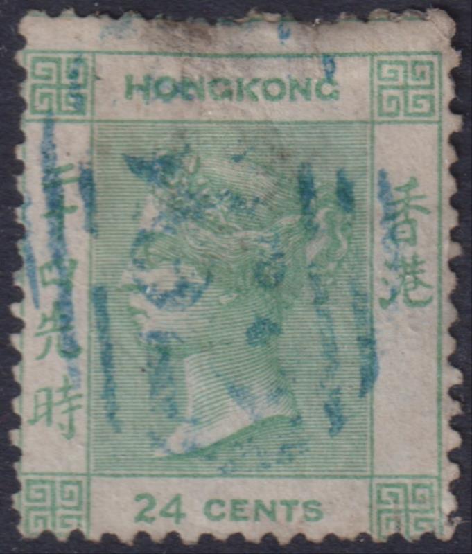Hong Kong 1862 24c QV green, weakness/short perfs at top. "B62" cancel in blue. SG 5. Cat £130. FU. (Image)