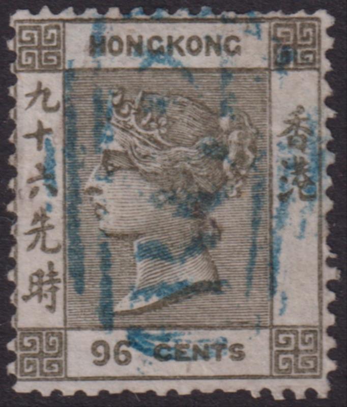 Hong Kong 1862 96c QV brownish-grey, blue B62 cancel, 2 short perfs RHS. SG 7. Cat £450. FU. (Image)