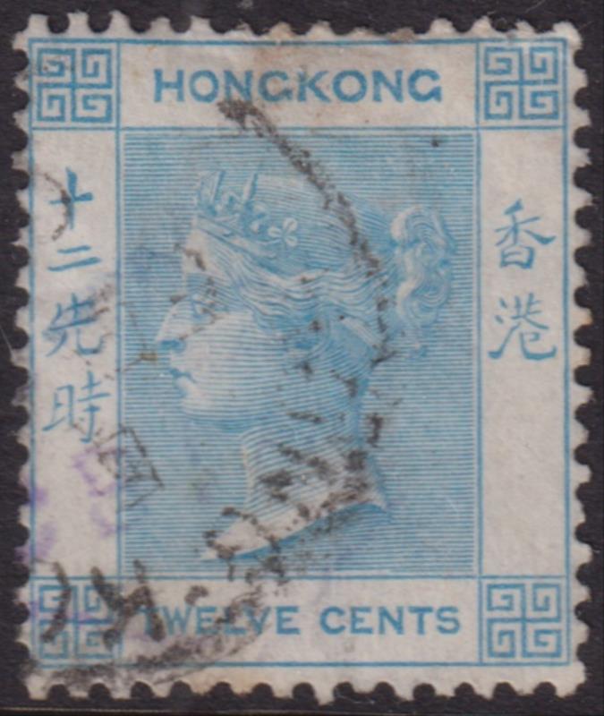 Hong Kong 1865 12c QV pale greenish blue, crown CC wmk, indistinct cds. SG 12. Cat £45. FU. (Image)