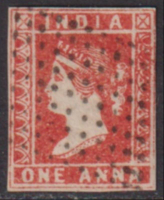 2783 U imageIndia 1855 1a QV red, die 3, imperf 4 quite close margins. Dotted Lozenge cancel. Multiple small brown spots on back. SG 15. Cat £225. FU. (Image)